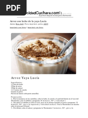 Sin quitar el cubilete ni abrir el vaso pesar en la misma tapadera el arroz programar 30 minutos 90º de temperatura giro a la izqda. 90º de temperatura y velocidad 1. Arroz con leche yaya lucía necesitarás 1 5 litro de leche 250gr de arroz 250gr de azúcar 1 ó 2 ramas de canela canela en polvo la piel de un limón solo parte amarilla así se prepara 1. Arroz yaya lucía ingredientes.