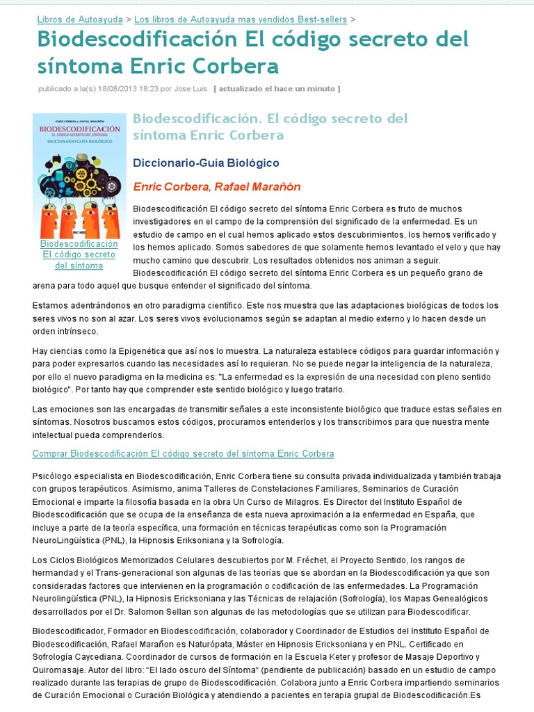 Biodescodificación el código secreto del síntoma enric corbera es fruto de muchos investigadores en el campo de la comprensión del significado de la enfermedad. Hide other formats and editions. Es un estudio de campo en el cual hemos aplicado estos descubrimientos los hemos verificado y los hemos aplicado. Enric corbera y montserrat batlló.