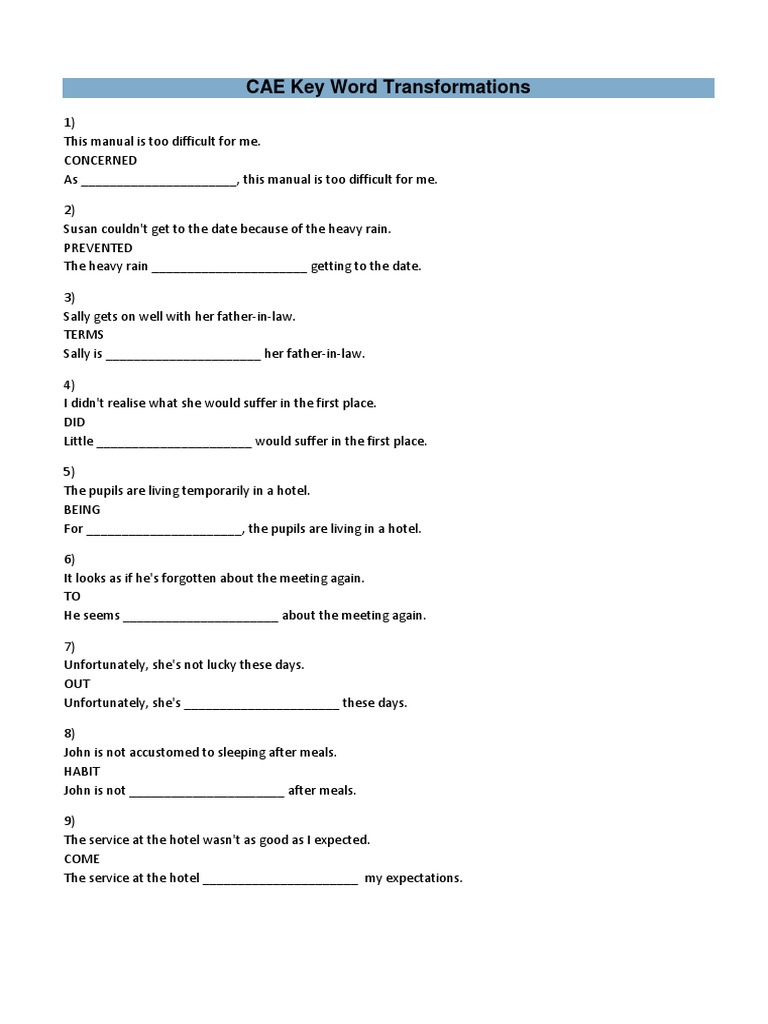Cae key word transformation exercises with answers pdf. In this part of the exam the candidate must read a sentence and then complete a second sentence with 3 6 words so that it has the same meaning as the first sentence. A sentence followed by a key word and a second sentence which has a gap in it. The file extension pdf and ranks to the documents category. The final part of the reading and use of english paper in the c1 advanced examination is key word transformations.