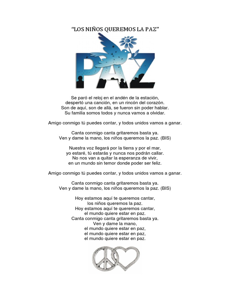 Los niños queremos paz los niños queremos paz x3 escuchando las noticias yo me pude. Canta conmigo canta gritaremos basta ya. Canción para trabajar el día de la paz los niños queremos la paz letra. Una canción difícil de encontrar la he subido con fines educativos.