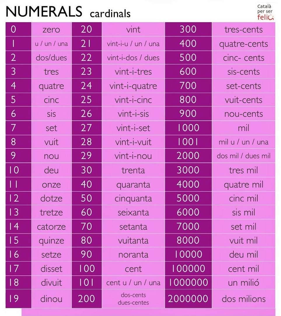 1 u un una 2 dos dues 3 tres 4 quatre 5 cinc 6 sis 7 set 8 vuit 9 nou 10 deu 11 onze 12 dotze 13 tretze 14 catorze 15 quinze 16 setze 17 disset 18 divuit 19 dinou 20 vint 21 vint i u 22 vint i dos 23 vint i tres 24 vint i quatre 25 vint i cinc 26 vint i sis 27 vint i set 28 vint i vuit. Si es fa servir la paraula corresponent a la unitat la xifra es pot escriure amb lletres. Són tots invariables llevat d un i dos que fan el femení en una i dues respectivament i cent que té les formes de plural cents. Pàgines a la categoria numerals ordinals en català eines.
