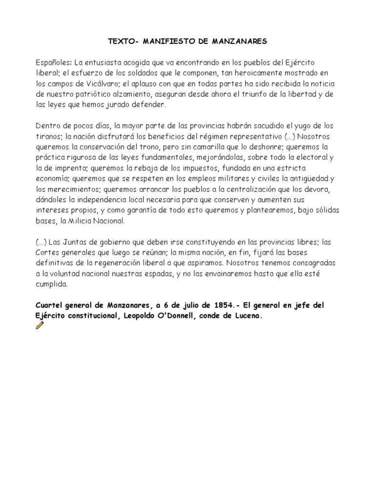 Comentario texto del manifiesto de manzanares 1658 palabras 7 páginas. El esfuerzo de los soldados que le componen tan heroicamente mostrado en los campos de vicálvaro. A través de este los protagonistas del alzamiento de la vicalvarada reivindicaron la reforma del sistema político español e inició el bienio progresista. La entusiasta acogida que va encontrando en los pueblos del ejército liberal.
