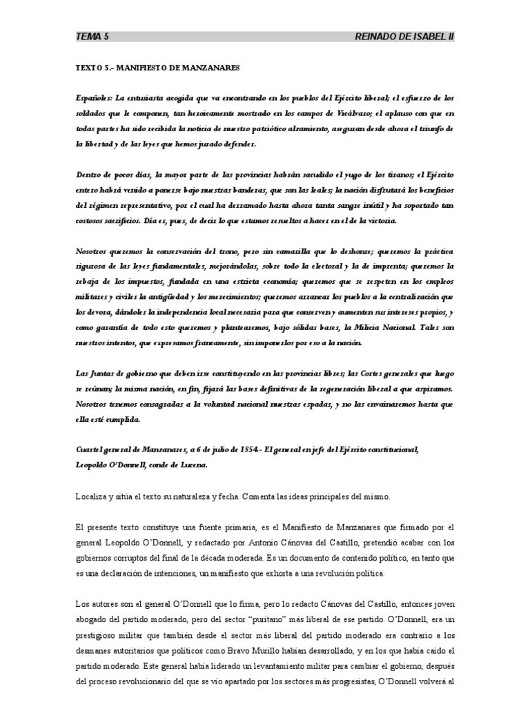 El presente texto constituye una fuente primaria es el manifiesto de manzanares que firmado por el. El aplauso con que en todas partes ha sido recibida la noticia de nuestro patriótico alzamiento. Tema 5 reinado de isabel ii texto 5 manifiesto de manzanares espa ntilde oles. El esfuerzo de los soldados que le componen tan heroicamente mostrado en los campos de vic aacute lvaro.