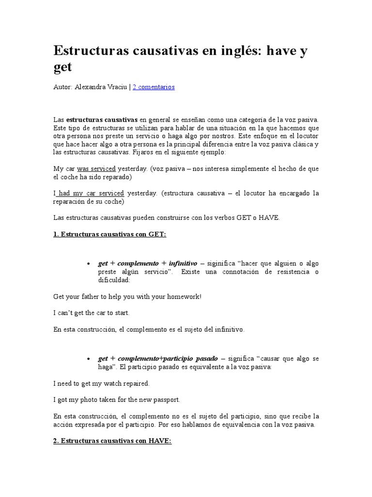 Ejercicios de pasiva y causativa en ingles. Se puede hacer las formas causativas tanto con el verbo get como con have. Si estableciésemos un ranking de los aspectos gramaticales de la lengua inglesa que más traen de cabeza a los estudiantes de inglés la causative form estaría entre las primeras. La forma causativa en inglés con get y have. Ejercicio activa a pasiva tiempos diversos.