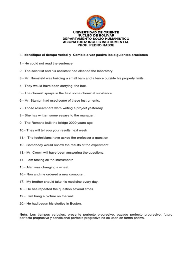 Ejercicios pasiva presente y pasado ingles pdf. En estas notas vamos a enfocarnos en el presente simple en la voz pasiva y con explicaciones. La mayoría de estos ficheros contienen conjunto de ejercicios que le ayudarán a enseñar si usted está enseñando esl primaria o secundaria. All our exercises can be done online as well. Recuerda que nuestro ejercicios tienen auto corrección y puedes auto evaluarte.