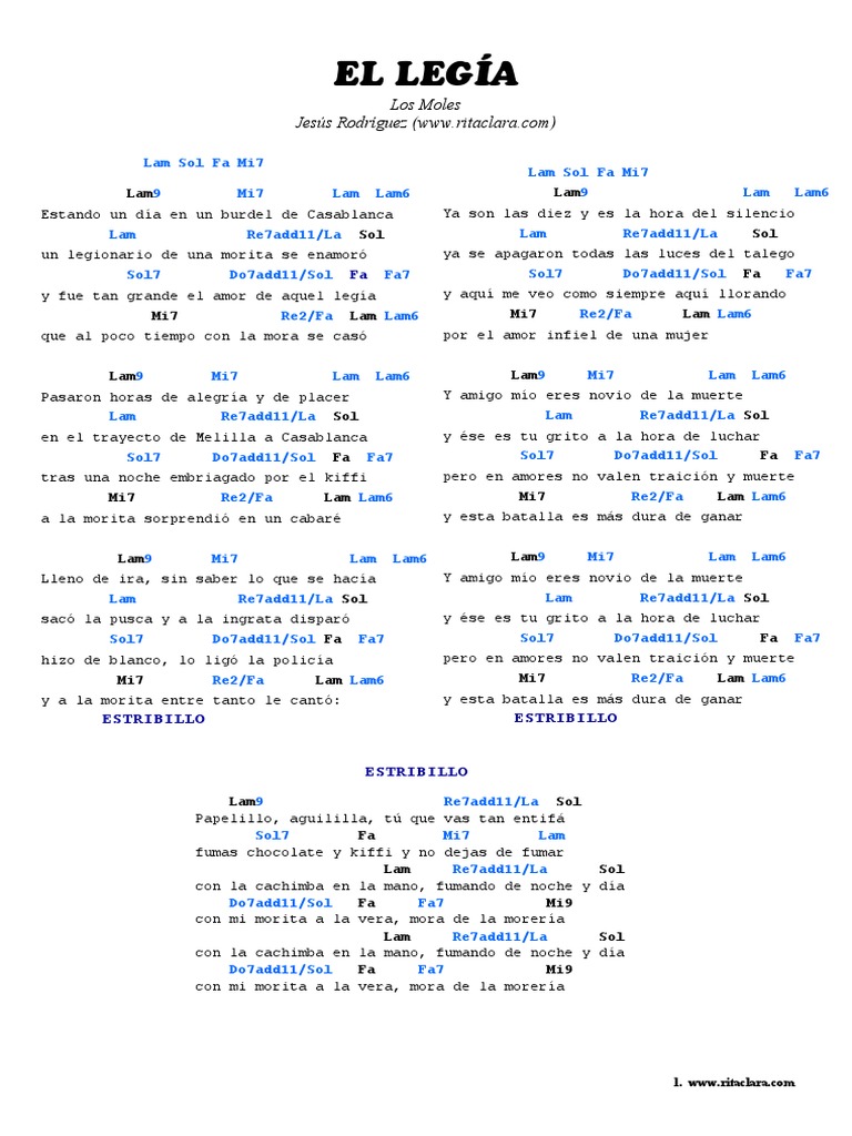 A forma dos acordes no tom de g capotraste na 2ª casa am y estando un día en un burdel de casa blanca g un legionario de una morita se enamoro f y fue tan grande el amor de aquel legia e e g am que al poco tiempo con la mora se caso pasaron horas de alegria y de placer g en el trayecto de melilla a casa blanca f que en una noche embriagado por el kiffi e e g am a la morita. Los moles letra de el legionario y la morita. Cómo tocar el legionario y la morita los moles. Esta cancion la tocaras mejor con la cejilla en el 2º traste.