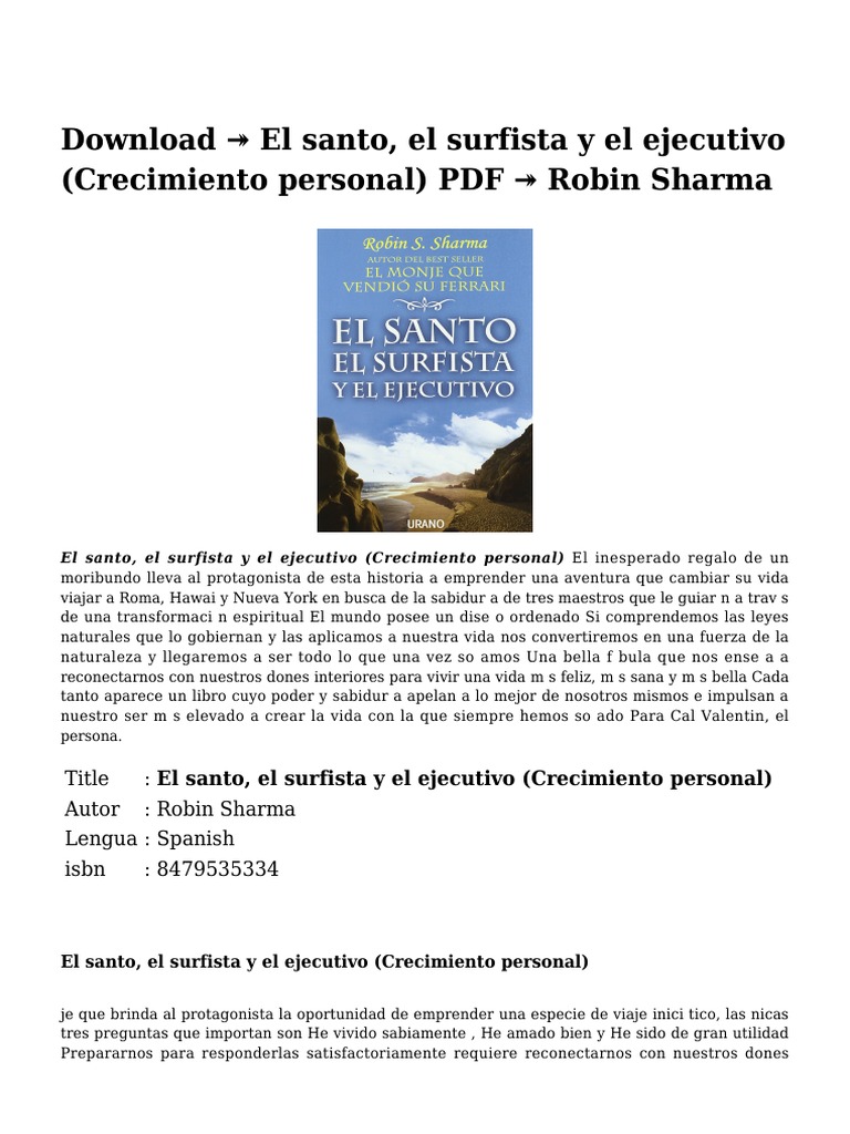 El santo el surfista y el ejecutivo pdf. Que viajará a roma hawai y nueva york en busca de la sabiduría de los tres maestros que le guiará a través de una transformación espiritual. Sentí que estaba en presencia de un maestro. By jazielon in types presentations y robin s sharma robin sharma el santo el surfista y el ejecut. Ejecutivo fiuxy bz book you are also motivated to search from.