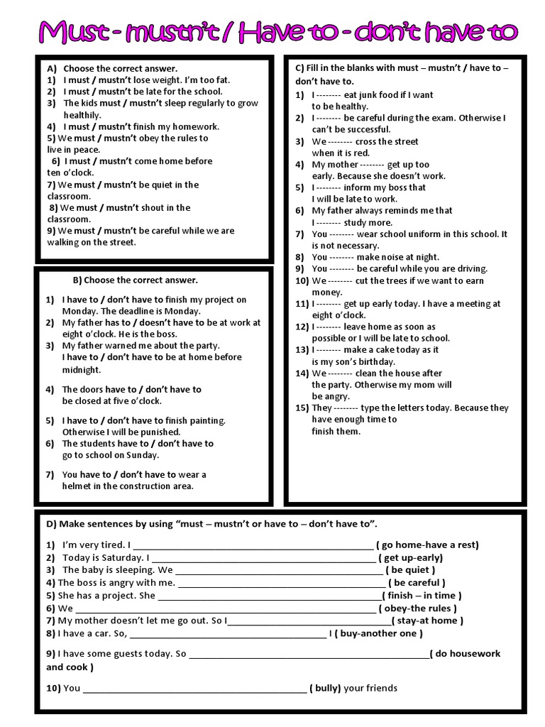 Must mustn t have to don t have to form. In this sentence we can see that i don t think it is a good idea to drink too much beer at the party and want to avoid doing it. A must b have to c mustn t d don t have to 13 i was late this morning because i wait a long time for the bus. Use must infinitive without to.