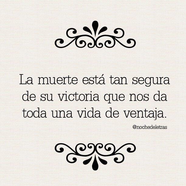 La muerte esta tan segura de victoria que nos da todo una vida de ventaja. Sabio y tan lleno de amor que entregó su vida para que después de un paso de la existencia que es la muerte obtengamos una vida mejor asi que vivamos nuestros días bien sabiendo ser felices y haciendo felices a los demás y la victoria será nuestra. Por eso hay que vivir cada dia como si fuese el ultimo de nuestra vida. Sólo para dormir que no tenga cuidado.