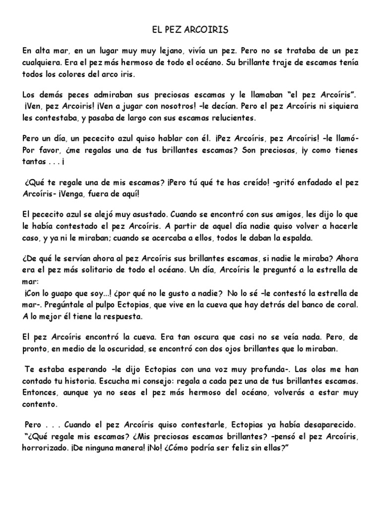 Letra del cuento el pez arcoiris para imprimir. Todos admiran sus brillantes escamas de colores. Cuento pez arcoiris para enseñar a los niños el valor de compartir. El pez arcoiris para imprimir es uno de los libros de ccc revisados aquí. Cuentos infantiles sobre peces.