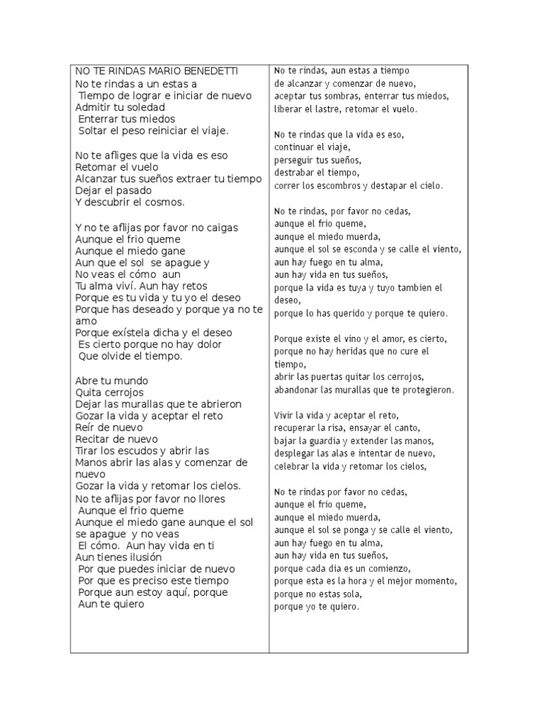 No te rindas poema de pablo neruda. El poema es todo lo contrario ya que habla de una pena de ausencia del ser amado. No te rindas a la vida si. No te rindas por favor no cedas aunque el frío queme. No te rindas mario benedetti pdf no te rindas mario benedetti año de publicacion de quien es no te rindas poema no te rindas de pablo neruda no te rindas mario benedetti analisis que quiere decir el poema no te rindas porque te quiero benedetti mario benedetti no te salves la vida ese paréntesis no te rindas mario benedetti analisis.