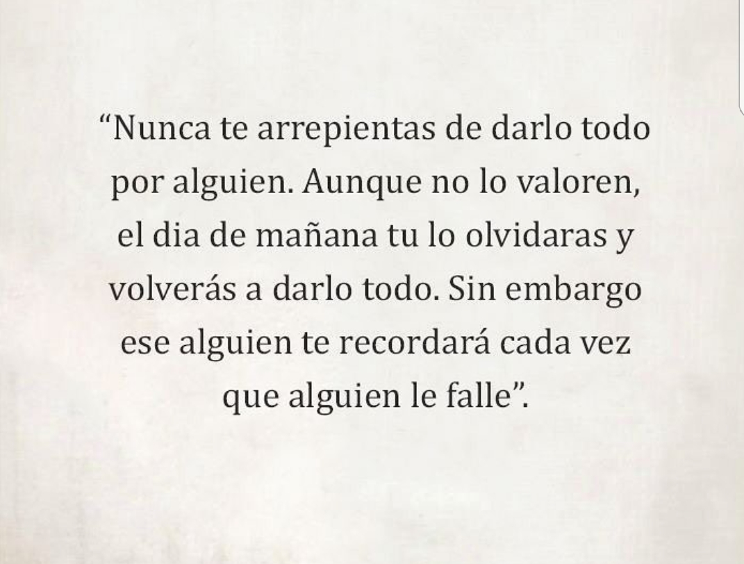 Nunca te arrepientas de darlo todo por alguien aunque no lo valoren el dia de mañana tu lo olvidaras y volberas a darlo todo. Nunca te arrepientas de dar todo por alguien. Sin embargo esa persona te recordará cada vez que alguien le falle. Sin embargo esa persona te recordará cada vez que alguien le falle.
