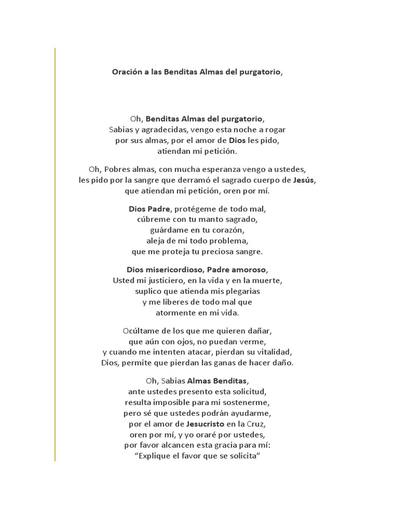 Oración a las animas benditas para el amor. No tienes suerte en el amor ya quieres formar una relación seria y estables no encuentras a la persona indicada para poder constituir una familia. Por ello quedaron en pena en el purgatorio mientras logran. Se cuenta que las ánimas benditas son referencia a unas entidades o almas que a pesar de ser buenos se encuentran en una dimensión alterna del mundo deambulando alrededor de las calles siempre en actitud de oración y de rezo las cuales buscan lograr su purificación completa y ascender al cielo ó con el objetivo de cuidar y ayudar a las personas que les rezan. Por esto la oración a las ánimas benditas para pedir un favor para atraer el amor.