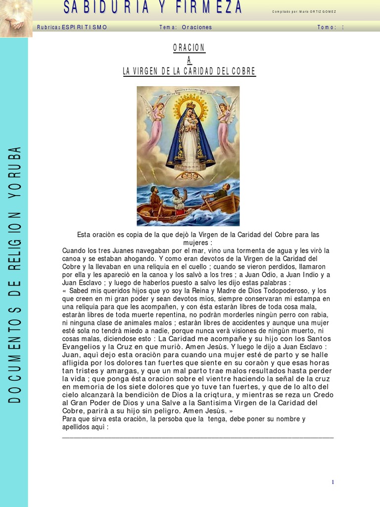 Oracion a la virgen de la caridad del cobre. He aquí que yo iluminado y movido por las gracias que vuestra maternal benevolencia abundantemente me ha obtenido del tesoro divino propongo poner mi corazón ahora y siempre en vuestras manos para que sea consagrado a jesús. Protege a sus hijos donde quiera que estén por eso nos encomendamos a ella en cualquier necesidad. Virgen de la caridad del cobre. Oración de la virgen de la caridad del cobre para la salud esta virgen es especializada en la caridad ella se encarga de ayudar al prójimo y una de sus ayudas principales es en la salud.