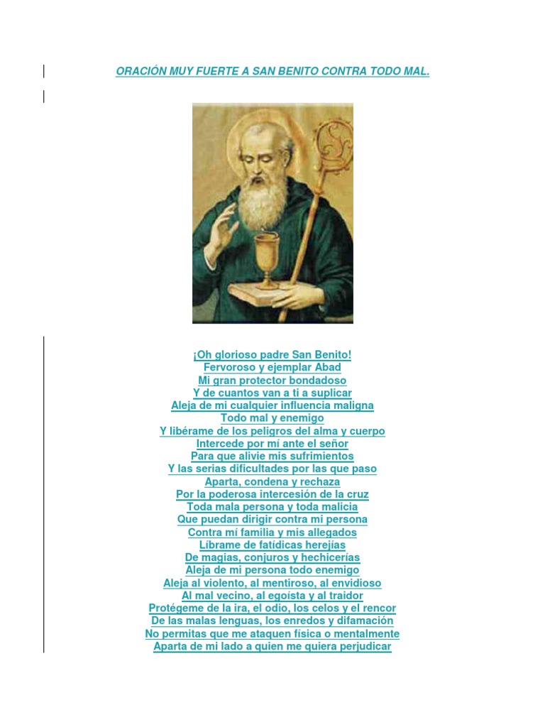 Si estás cansado de las malas personas las envidias y los problemas en general te invitamos a hacer esta milagrosa oración a san benito para pedirle que nos ayude a alejar todo esto de. San benito fue un poderoso exorcista del mal dios le concedió el don para doblegar a los espíritus malignos es por eso que las oraciones a san benito son conocidas por su poder para alejar el mal y su capacidad de protección si tu sientes que el mal te persigue debes hacer esta poderosa oración a san benito con mucha fe para liberarte de toda maldad. Si en alguna ocasión has sentido que el mal te persigue notas que una persona te tiene envidia y te quiere hacer daño o te ha lanzado un hechizo en tu contra. Virtuoso padre san benito glorioso maestro de la vida espiritual hombre justo lleno de bondad y.