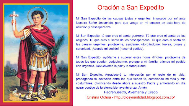 Oración a san expedito para el amor. Descubre la letra de la oración a san expedito para el amor y añádela cada día en tus reflexiones cristianas y en cada momento que dediques a la oración. Recuerda siempre acompañar las plegarias a san expedito con velas de color rojo o de color verde. Poderoso san expedito solidario con los que sufren.