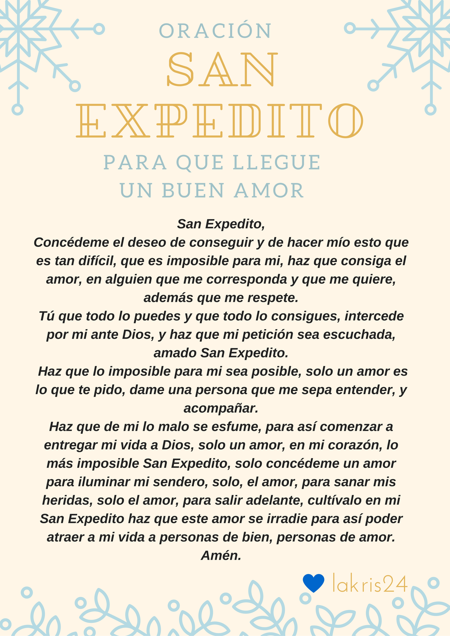 San expedito logra hacer volver o encontrar hasta el amor que creemos es imposible y si te sientes desesperanzado no decaigas porque san expedito te dará ese amor que tanto anhelas. Existen muchas oraciones a san expedito para el amor todas igual de poderosas porque lo que le da el poder a ellas es la fe que le imprimes al momento de realizar la oración y mientras más fe tengas más fuerte será esa oración y será escuchada con mayor devoción. Oración a san expedito para el amor. También una forma real es creer en algo tan generoso como lo espiritual una oración a san expedito para el amor te caerá de perla si quieres lograr el milagro de conseguir una persona especial que sea tu alma gemela.