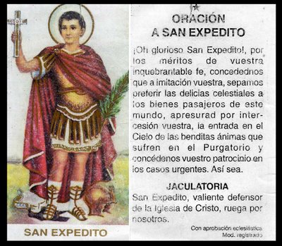 La oración a san expedito para pedirle por el dinero o un empleo es una oración en petición al santo de las causas justas y de máxima urgencia para que él nos guíe por el sendero de la fortuna y las riquezas y no decaigamos más en necesidades de la vida tengamos el pan de cada día y nos sobre cierta cantidad para mantener cómodamente a nuestra familia y nuestro hogar seamos.