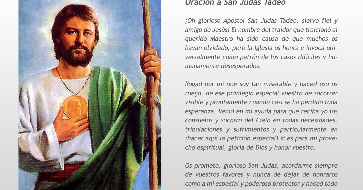 Oración a san judas tadeo para casos difíciles oh venerado san judas tadeo fiel amigo y siervo de nuestro señor son muchos los que te honran e invocan en todo el mundo eres el patrón de los imposibles de las causas desesperadas. Oraciones a san judas tadeo para casos difíciles y desesperados oración a san judas tadeo para el amor santo apóstol de jesús tú que conociste el amor verdadero y sentiste el poder de dios hecho hombre ayúdame a terminar con el odio y el dolor que dominan mi corazón. San judas tadeo manifiesta su ayuda y protección especial en socorrer a sus devotos de aquellos casos en que toda esperanza humana parece faltar y por eso el pueblo fiel le aclama con el título de abogado especial de los casos difíciles y desesperados. Basta para convencerse de que nuestro santo apóstol alcance también a los que imploran.