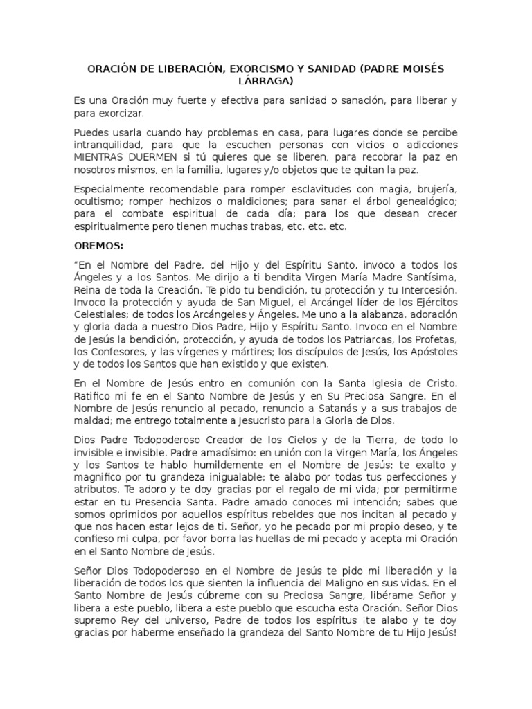 Oracion de liberacion exorcismo y sanidad del padre moises lárraga. Oracion de liberacion exorcismo y sanidad del padre moises. Purifica y bautiza a los niños abortados con la preciosa sangre y agua que brotó del sagrado costado de tu hijo que colgaba muerto en la cruz para salvarlos en el nombre del padre del hijo y del espíritu santo se asperja agua bendita que a través de la santa muerte de cristo ellos reciban la vida eterna por sus llagas sean sanados y. Enzo de la virgen. Mundo católico oraciones 3 706 707 views.