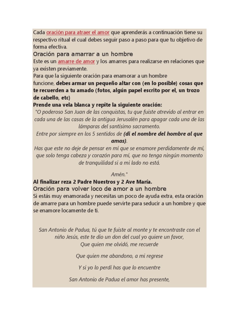 Esta oración para dominar a un hombre es muy fuerte y puedes usarla para dominar hombres y mujeres tendrás el dominio completo de la persona que quieras harás que esa persona viva por ti respire por ti que. Es por ello que se aplica la oración para atraer a un hombre que me gusta también existen diversos trucos infalibles que nos permiten valernos de las caricias de los hombres con estas oraciones se puede tener la seguridad de obtener mejores resultados solo se debe aprender en aprovechar el beneficio al utilizar esta oración y tener una completa fe. Formación especializada en videncia clarividencia contacto espiritual y leer las cartas. 3 oraciones para dominar a un hombre rápida y efectivamente las oraciones para dominar a un hombre son sumamente fáciles y rápidas a la hora de hacer el efecto los resultados son visibles de inmediato además este tipo de oraciones las puedes realizar las veces que desees y con el hombre que prefieras.