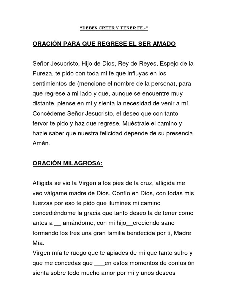 Para que vuelva la persona amada. Estas oraciones milagrosas puedes hacer en cualquier momento para que te busque para desesperar a alguien y otros objetivos más estas oraciones. Te deseo buena suerte en tu amor. La oración de las almas para traer amor de vuelta puede ser rezada junto con las otras oraciones para que regrese el ser amado de inmediato para que puedas obtener el mayor poder para tu petición.