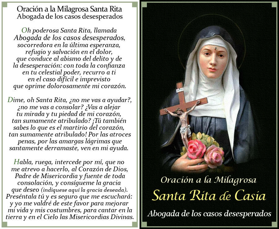 Santa rita oracion para los casos desesperados. Santa rita patrona de los casos imposibles y desesperados. Oh poderosa santa rita llamada abogada de los casos desesperados socorredora en la última esperanza refugio y salvación en el dolor que conduce al abismo del delito y de la desesperación. Santa rita de cassia abogada de los casos desesperados y perdidos pide a tu amado esposo y redentor del mudo me ayude y se haga justicia en mi trabajo te suplico con todo mi corazón por dios ayudame mi patrona hacer justicia divina tu siempre me escuchas ayudame para que mis compañeros se dediquen a trabajar hacer el bien a los demás aparta. Oracion a santa rita para casos imposibles desesperados perdidos.