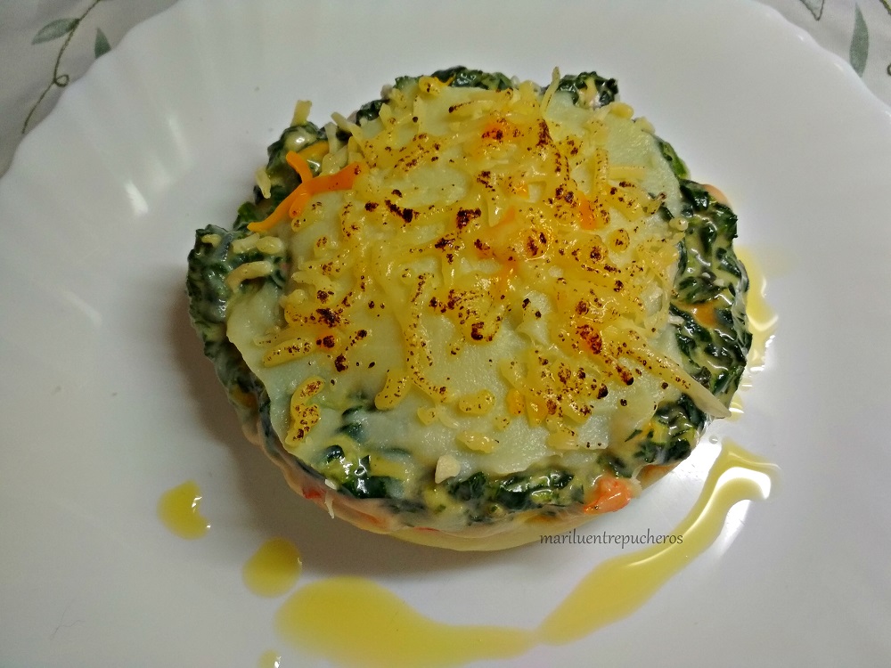 Preparamos hoy un timbal de puré de patatas con ensaladilla perfecto para el verano muy fácil y saludable. De las patatas del abuelo especial guisar 200 g de gambas crudas limpias 400 ml de nata para montar 100 g de nueces 16 tomates cherry 8 espárragos verdes. Este timbal tiene tres protagonistas las alcachofas el puré de patatas y las gambas. 8 patatas medianas 200 g de gambas crudas limpias 400 ml de nata para cocinar 100 g de nueces 16 tomates cherry 8 espárragos verdes 3 cucharadas soperas de caldo de carne 1 chalota no muy grande vinagre de módena sal perejil nuez moscada queso rallado aceite y agua.